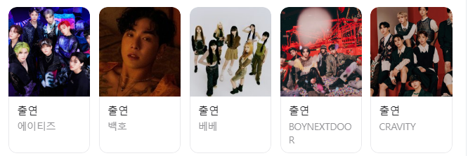 &TEAM부 (G)IDLE, 2AM, aespa, ATBO, ATEEZ, BEBE, BOYNEXTDOOR, CRAVITY, DAY6, ENHYPEN, FANTASY BOYS, 프로미스나인, ITZY, IVE, LUCY, NCT 127, NCT DREAM, NCT U, NiziU, NMIXX, RIIZE, SHINee, STAYC, Stray Kids, ZEROBASEONE, 권은비, 백호, 다이나믹 듀오, 더보이즈, 영탁, 원탑, 윤상, 이영지, 이적, 장민호, 주주 시크릿, Kep1er, 폴킴, 효연까지 총 40팀이 특별한 무대를 펼칠 예정입니다.