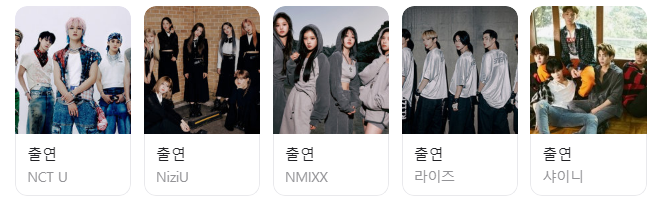 데뷔한 신인 가운데 보이그룹으로는 BOYNEXTDOOR, ZEROBASEONE, RIIZE, FANTASY BOYS가 출연하고, 3세대 뿐만 아니라 2세대인 SHINee, 2AM도 출연자로 명단에 올라갔습니다. 걸그룹 중에서는 JYP의 일본 현지화 그룹 NiziU가 유일하게 신인으로 참여하며, 3세대에서는 프로미스나인과 (여자)아이들만이 출연이 확정되어 성비 불균형이 다른 2023년 연말 가요제와 동일하게 나타났습니다.