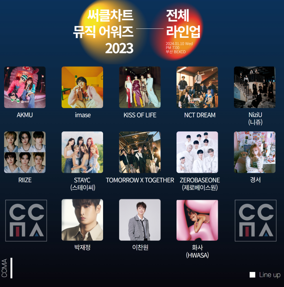 부산 벡스코에서 처음으로 개최되는 '써클차트 뮤직 어워즈 2023'에서는 AKMU(악뮤), imase(이마세), KISS OF LIFE(키스오브라이프), NCT DREAM, NiziU(니쥬), RIIZE(라이즈), STAYC, TOMORROW X TOGETHER, ZEROBASEONE(제로베이스원), 경서, 박재정, 이찬원, 화사(HWASA)까지 총 13팀이 무대를 빛내줄 예정입니다.