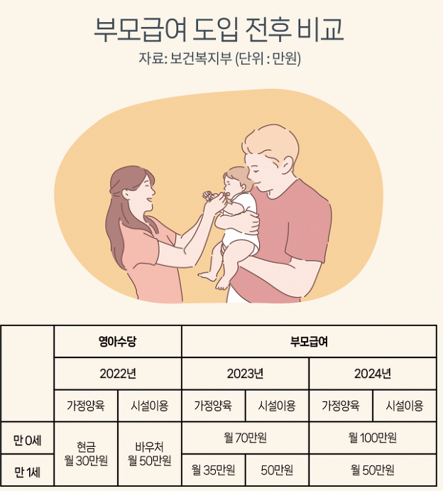 기존에는 0세 가정의 부모급여가 월 70만원이었고, 1세는 월 35만원이었습니다.