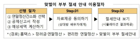 근로자는 편리한 연말정산 서비스를 활용하여 예상 세액을 손쉽게 계산할 수 있습니다. 맞벌이 부부는 자녀와 부모 등 부양가족 공제를 조합하여 세금 부담이 가장 낮은 경우를 시뮬레이션하여 선택할 수 있습니다.