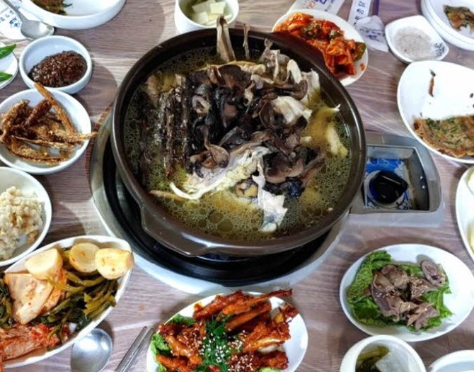 주문 시 풍부한 반찬과 함께 특유의 진한 국물이 가득한 백숙이 나오게 됩니다.여기는 영계를 사용한 부드럽지 않고, 처음 접하는 이에게는 다소 쫄깃한 식감으로 느껴질 수 있는 특별한 백숙입니다. 국물은 매우 진하며, 고기를 다 먹은 후에는 풍부한 맛의 죽이 경이로움을 더한다고 하는데요