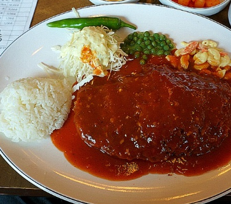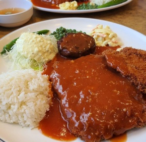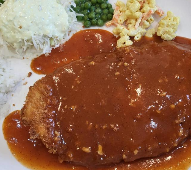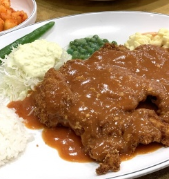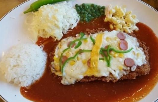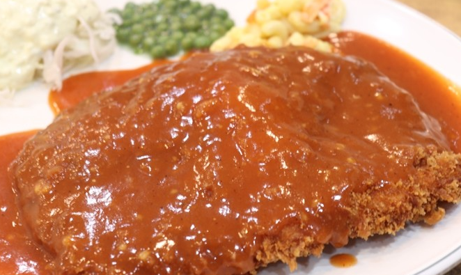 이 곳에서는 수프와 마카로니, 샐러드, 그리고 완두콩 등 다양한 고객 취향을 고려한 조합으로 가득한 옛날식 왕돈가스를 제공하고 있습니다.