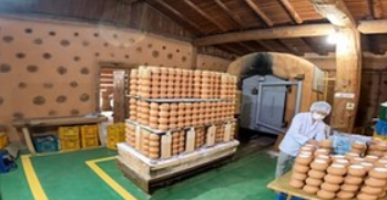 이곳은 황토 항아리를 활용하여 소금을 구워내는 특별한 장소로, 마을 입구에서부터 황토와 너와지붕이 돋보입니다. 양질의 소금을 생산하기 위해 충남 예산에서 직접 황토를 캐내어 항아리를 제작합니다. 이 황토 항아리에는 거의 1톤에 달하는 소금을 천천히 채워 넣는데, 이 작업을 수행하면서 항아리를 안전하게 쌓아 올리는 과정이 필수적입니다. 항아리 4개를 쌓아 올리는데는 6시간 이상이 소요되며, 그 후에는 12시간 동안 가마에 불을 피우고 온도를 800도까지 올려, 천일염 내에 남아있는 불순물을 제거하기 위한 불을 조절합니다.