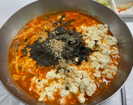 순두부는 고소하고 포슬포슬한 식감을, 양미리는 진한 풍미와 쫄깃한 식감을 장칼국수에 더해줍니다.