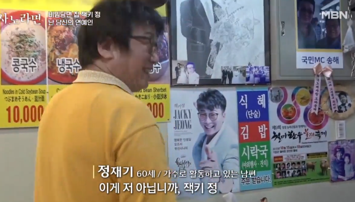 하지만 이 가게에서 비빔당면만큼이나 유명한 것이 하나 더 있습니다. 바로 남편 정재기 씨, 일명 '잭키 정'입니다. 9년 전, 노래를 배우기 시작해 자비로 음반을 낸 정식 가수이기도 한 재기 씨는 평소 성룡을 좋아해 ‘잭키’라는 이름을 붙였고, 본인의 성을 더해 ‘잭키 정’으로 활동하고 있습니다.