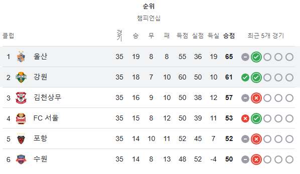 올해 K리그 최다 득점(60골)을 기록 중인 강원은 양민혁, 이상헌, 코바체비치를 앞세워 울산 원정에서 승리를 노리고 있습니다. 강원이 울산전에서 승리한다면 구단 첫 우승의 꿈도 현실에 가까워집니다. 강원이 울산 원정에서 이길 경우, 두 팀의 승점 차는 1점으로 좁혀져 트로피의 향방은 마지막까지 알 수 없게 됩니다.2009년 K리그에 뛰어든 이후 최고 성적이 6위였던 강원으로서는 결코 물러설 수 없는 중요한 경기입니다.
