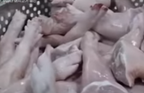 족발을 만들기 전에 가장 중요한 과정은 핏물을 제거하는 일입니다. 이 공장에서는 족발을 수조에 넣고 12시간 동안 핏물을 제거합니다. 이 과정은 족발의 맛을 결정짓는 중요한 단계입니다. 핏물이 완전히 제거되지 않으면 족발에서 특유의 잡냄새가 나게 되기 때문입니다. 하지만 단순히 시간을 두고 물에 담궈 놓는 것만으로는 완벽한 핏물 제거가 이루어지지 않습니다. 이를 위해 수조에 담가놓은 족발을 토치와 도구를 사용해 털을 제거하고 면도를 합니다. 털을 제거한 후에도 여전히 핏물이 남아 있는 부위가 있기 때문에, 2차 작업을 통해 잔혈이 모이는 관절이나 앞면 등 부위까지 칼로 세밀하게 손질해야만 합니다. 이 과정에서의 정성이 없으면 족발에서 비린내가 날 수 있기 때문에, 12시간 이상의 시간이 들더라도 철저히 진행되는 작업입니다.