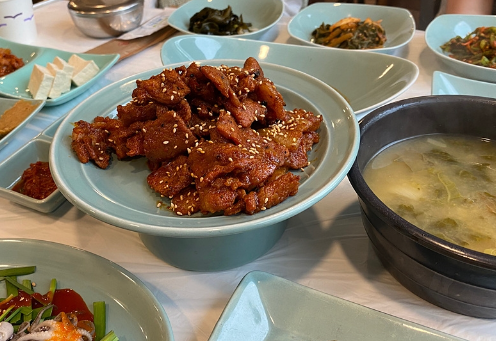 상차림은 풍성한 반찬과 새우 샐러드 회 등 다양한 반찬으로 푸짐하게 차려지며, 메인 메뉴인 돼지불고기가 중앙에 위치합니다 특히 불냄새가 향긋하게 퍼져 나오며, 맛깔스러운 돼지불고기는 산해진미와 함께 제대로된 남도의 맛을 느낄 수 있는 요리입니다. 이곳은 전통적이면서도 특별한 맛과 경험을 손님들에게 제공하며, 한약재의 효능과 유서 깊은 가정식 백반의 전통을 계속 이어가고 있습니다 정말 맛있다고 하는데요 아래에서 연탄돼지불고기 주문해보시기 바랍니다